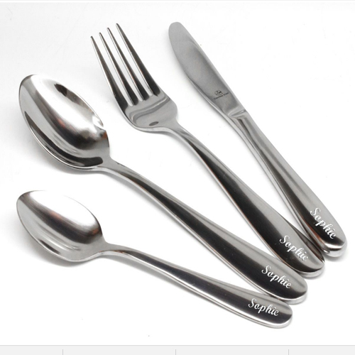 4pc stainless steel cutlery includes 1 dinner knife, fork, dessert spoon and teaspoon. The knife is non-serrated for extra safety. If you want to be unique and want your favourite forks and knives always saved for you then this 4-piece Personalized Cutlery Set is for you. Once your kid starts using this customized cutlery set then they don’t feel like using any other set again. A personalised 4pc stainless steel cutlery will make a beautiful and wonderful gift for any child on a variety of occasions.